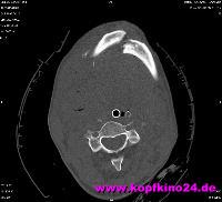 Der Atlas ist an 2 Stellen mit dem Hinterhauptknochen mittels sog. Eigelenk verbunden. Das ermöglicht das Ja-Sagen sowie das seitliche Abkippen des Kopfes. Auch dort befand sich an der rechtes Seite des Atlas eine Fraktur. |